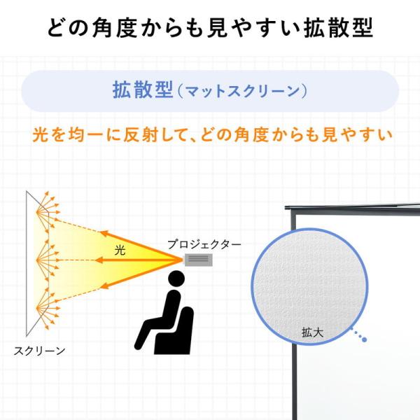 100インチワイド(16:9)対応のプロジェクタースクリーンです。置いて引き出すだけの簡単設置!自立式で床置きで使えます。