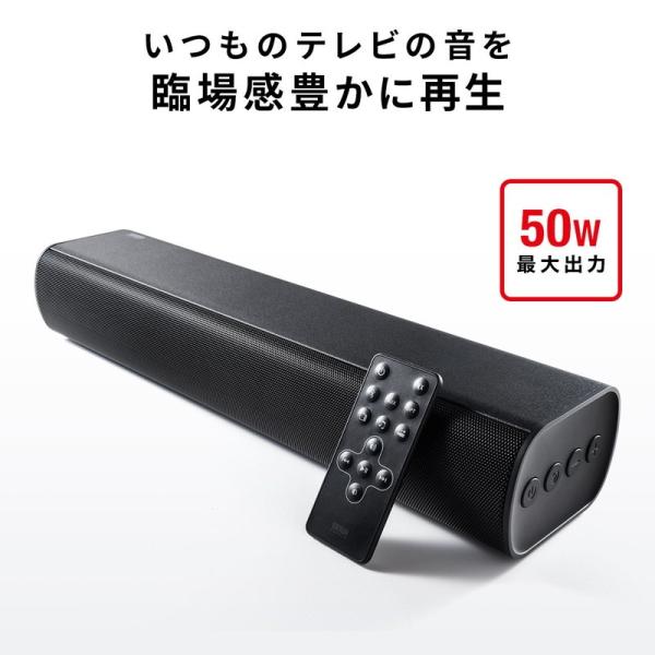 省スペースに設置できるコンパクトサイズのサウンドバースピーカー。テレビやPCなどで最大50Wの迫力あるサウンドを再生。iPhoneやiPad、Androidスマートフォンなどで使えるBluetoothのワイヤレス接続も対応。低音強調パッシブラジエーターも搭載した2chスピーカー。
