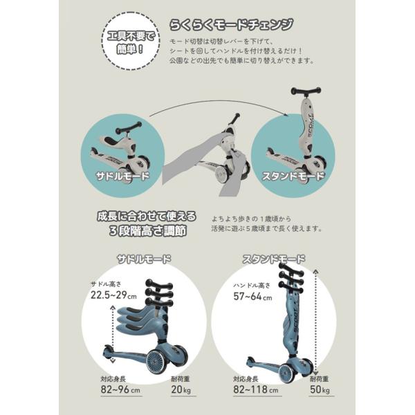シートに座って乗る【サドルモード】と立って乗る【スタンドモード】の2wayで楽しめます。