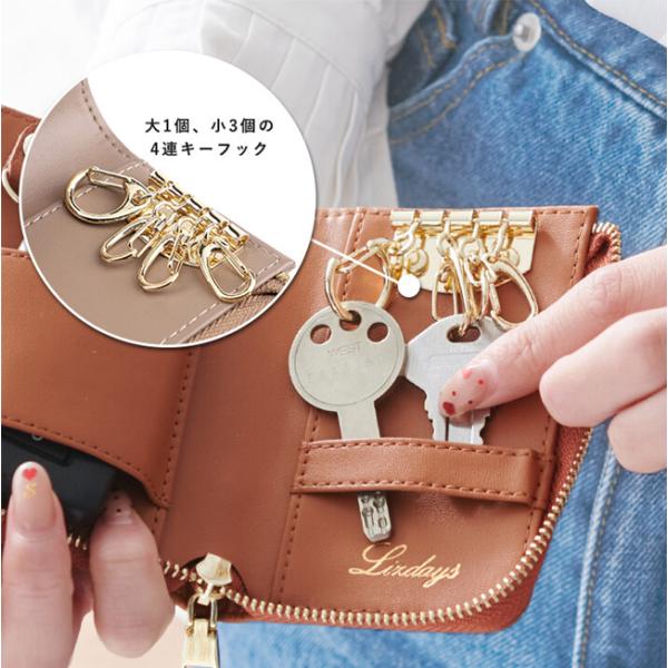 内側:4連キーフック、スナップボタン付きリング、カードポケット×2