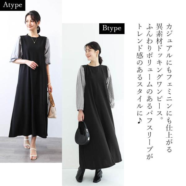 ワンピース レディース カジュアル ロングワンピース ロング丈 同窓会 二次会 食事会 膝下丈 膝下 フェミニン 異素材 ドッキングワンピース パフスリーブ トレンド感 10代 20代 30代 春 きれいめ ロング 体型カバー ゆったり 大きいサイズ ラウンドネック rt3420