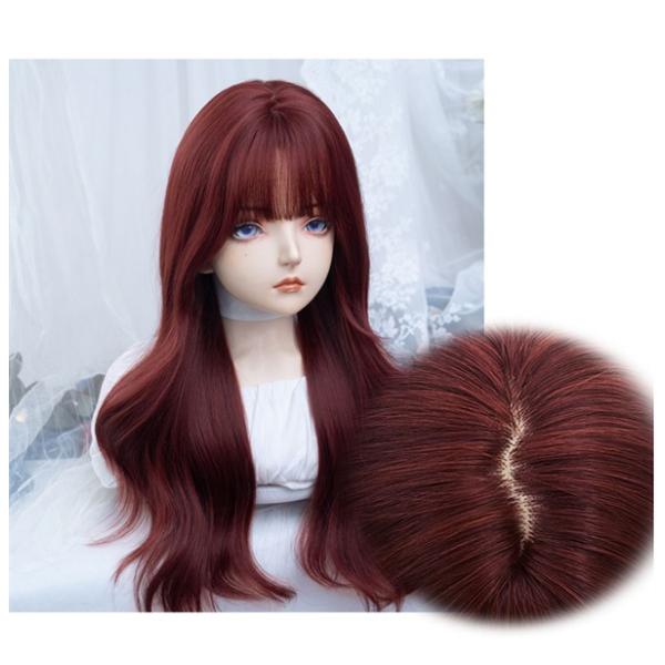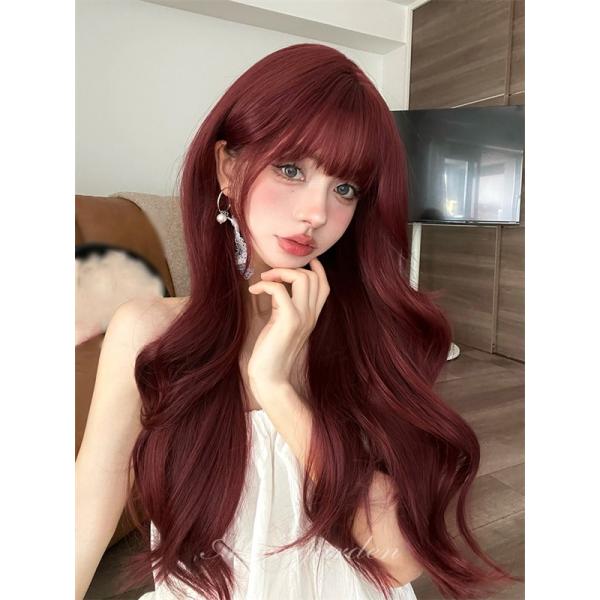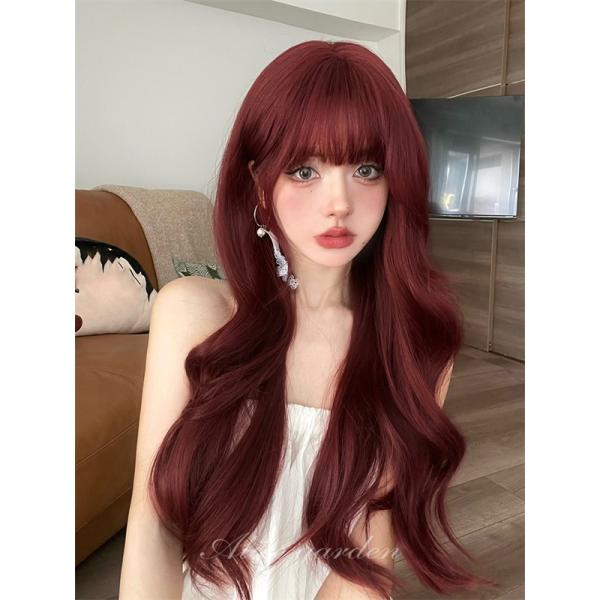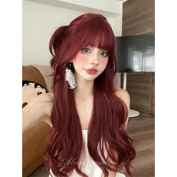 ウィッグ フルウィッグ 赤 赤髪 ワインレッド ロング 巻き髪 ぱっつん前髪 前髪あり 可愛い かわいい 大人用 コスプレ ロリータ ゴスロリ コスチューム 原宿風 仮装 超自然 かつら wig Lolita 小顔 文化祭 イベント 学園祭 ハロウィン