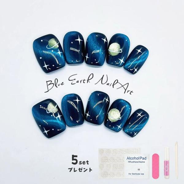 宇宙 ネイルチップ 星空 惑星 デザイン ネイビー ブルー ギャラクシー 地球風 マグネット風 ラメ ネイル チップ 付け爪 ショート ミディアム レディース