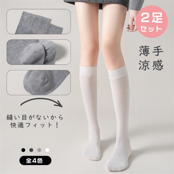 レディース ハイソックス 2足セット 薄手 リブ 無地 涼感 抗ピリング 縫い目なし 蒸れにくい 高筒 ソックス クシュクシュ 直角ヒール 通勤 カジュアル