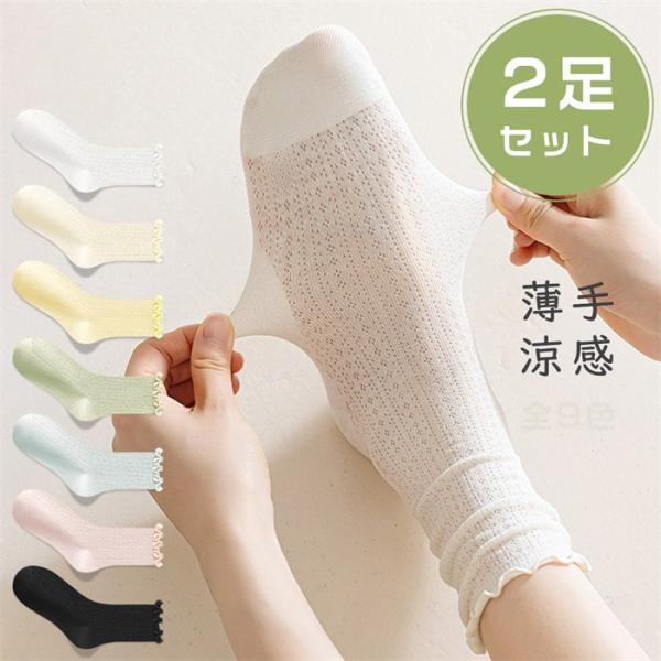 送料無料 レディース ソックス 夏用 フリル メッシュ 薄手 透け感 花柄 くしゅくしゅソックス ロング丈 涼感 吸汗 ルーズソックス ガーリー コットン 綿素材