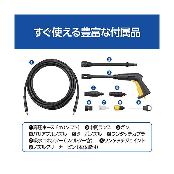 ガン・ホースの接続が工具いらずでワンタッチで可能な家周りの掃除に適した動作音が静かな高圧洗浄機です。自動車、外壁、ベランダ、玄関周り、農機具等の清掃。従来商品から体感騒音を約40%ダウンしていますので動作音が静かで住宅地などでも気兼ねなく洗浄できます。質量:4.5kgと軽量なので持ち運びや収納がしやすいです。高圧ホースがワンタッチで接続可能(本体側・ガン側共に)です。従来製品で採用している高圧ホースから約40%柔軟性がUPしているので洗浄中にホースを気にする必要がなくスムーズに作業できます。洗浄シーンによって使い分けできるターボノズルとバリアブルノズルを標準付属しています。●電源:単相100V。●消費電力:1200W。●最?許容圧?:10.0MPa、最?吐出?量:8.0L/min。●許容水温:40℃以下。●給水方式:水道・自吸。●電流:12.5A、コード:5m。●ポンプ形式:3連プランジャ。●品名コード:668300A。●ハウジング:PP。●ガン・ノズル:PA・PA。●高圧ホース:PVC。●付属品:中間ランス×1・バリアブルノズル×1・ターボノズル×1・高圧ホース(6m)×1・ワンタッチカプラ×1・ノズルクリーナーピン×1・ワンタッチジョイント×1・吸水
