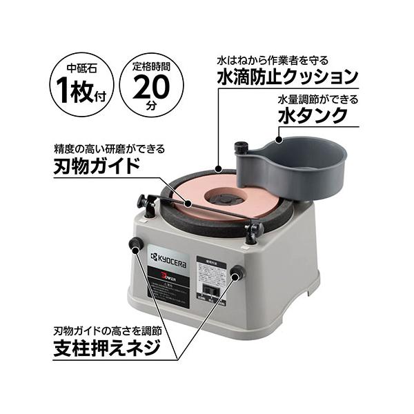 焼き戻りのない水研ぎ研磨ができるハサミ・包丁等の研磨に最適な卓上タイプの研磨機です。包丁(菜切・文化・牛刀・刺身・出刃・ペティ)・カンナ・ノミ・彫刻刀など刃物の研磨。簡単に上下調節ができる水滴防止用クッション付きです。便利な刃物ガイド付きです。●電源:単相100V。●定格電流:1.3A。●消費電力:125W。●定格時間:20分。●回転数:400min-1(50Hz)・470min-1(60Hz)。●砥石寸法:外径180×内径70×厚さ20mm。●コード:1.8m。●品名コード:4152000。●ハウジング:ABS。●タンク:AS。●電源コード:PVC。●付属品:刃物ガイド×1・水タンク×1・中砥石(1000番手)×1・排水ホース×1・スパナ×1。取扱説明書をお読みの上、正しくお使いください。本機の定格時間は20分です。本機のスイッチは左回転、停止、右回転になっていますので、砥石の回転方向を変えるときは一度スイッチを切り回転が停止してから逆回転のスイッチを入れて下さい。使用に際しては安全のため保護メガネの着用を心掛けてください。砥石は純正品を使用してください。工具類(砥石など)や付属品は取扱説明書に従って確実に取付けてください。