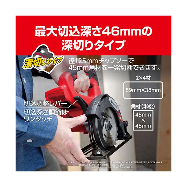 45mmの米松が一発切断可能なハイパワーと軽量コンパクトで取り回しの良さを兼ね備えた18Vリチウムイオン電池仕様の充電式丸ノコです(充電器・電池パックは別売です)。DIYでの切断作業(2X材)、木材の切断(米松・集成材・ベニヤ板、ハードウッド)、リフォーム時の切断作業。軽量コンパクトで取り回しが良いのでDIYからリフォームまで幅広く使用できます。18V高出力缶モーター採用でハイパワーです。替刃で流通性の高い125mmを使用しています。低重心で本体のバランスが良いです。刃物交換時の安全性が向上しています。●ノコ刃:(外径)125mm・(内径)20mm。●刃数:24。●回転数:3400min-1。●最大切込深さ(90度/45度):46mm/27mm。●充電時間:約69分。●品名コード:600101B。●充電器・電池パック:別販売品。●ハウジング:PA+TPE。●ベース:鉄。●付属品:六角棒レンチ(5mm/本体収納)×1本・125mmチップソー(外径125mm×内径20mm×刃先厚1.2mm、刃数24)×1枚。取扱説明書をお読みの上、正しくお使いください。切込深さは切断する材料の厚さに合わせて調整してください(材料の下端からノコ刃が少し見える位が目安です)。長い材料を切断する場合は角度定規やソー