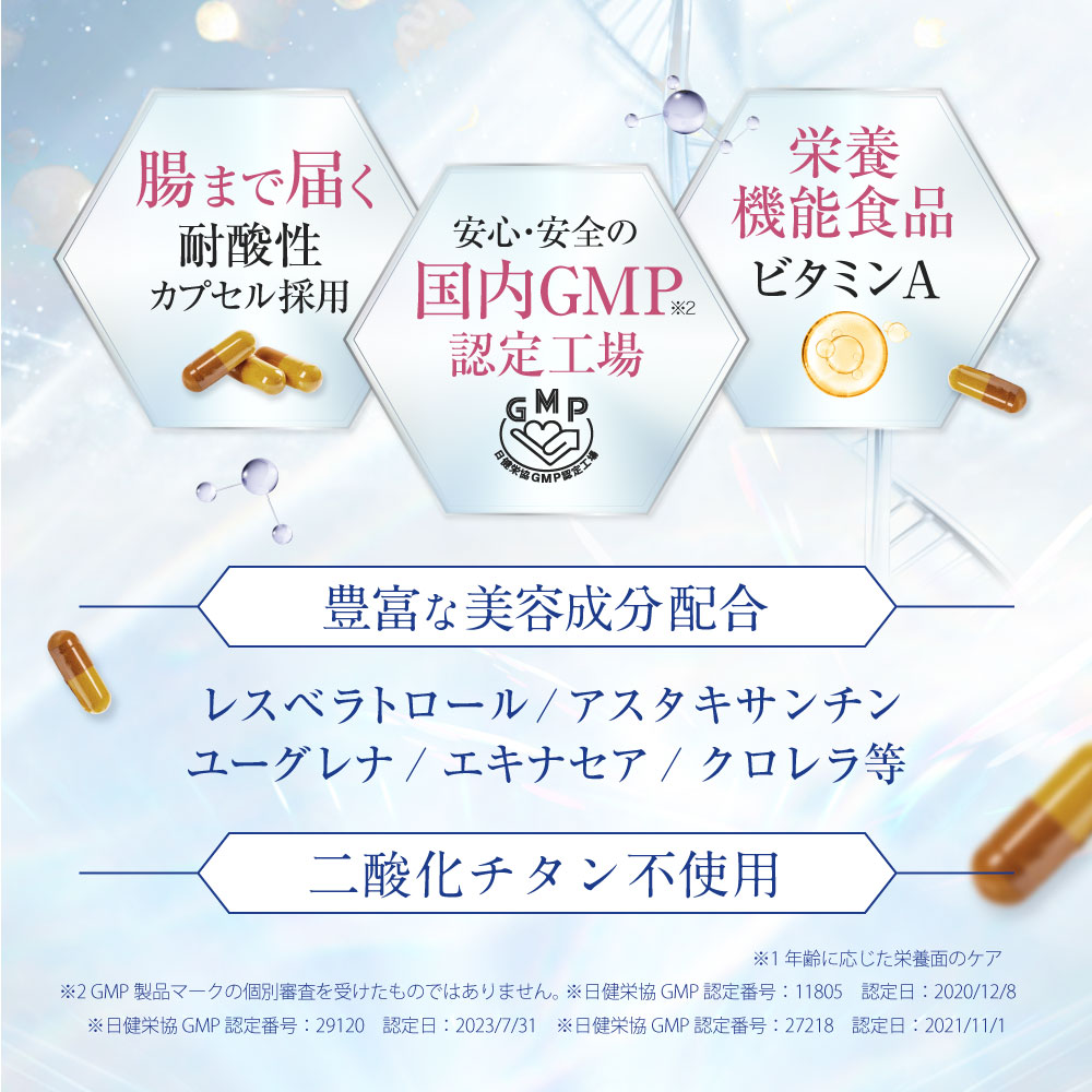 レスベラトロール、アスタキサンチン、ミドリムシ、クロレラなどを配合。