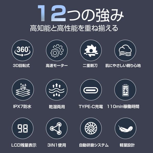 シェーバー メンズ 髭剃り 多機能シェーバー 3IN1 電気シェーバー ひげそり 電動ひげそり 回転式 3枚刃 LCD電池残量表示 防水 type-c充電 ロック機能 トリマー刃