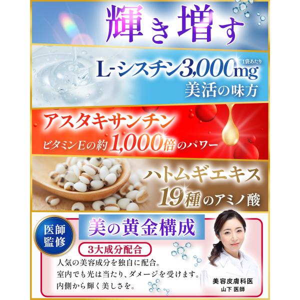 【 美容皮膚科医 監修 】 注目の3大美容成分、アスタキサンチン、L−シスチン、ハト麦 が配合。内から美を支えイキイキとした毎日へ。