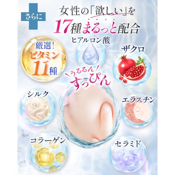 【 24種の美容成分を贅沢チャージ 】 ビタミン11種、ザクロ、ブライトニングパインなど、自然由来の美成分をたっぷり配合。さらに、セラミド エラスチン シルク、プラセンタ、ヒアルロン酸、レスベラトロールなどで、美しさの土台を内側から整え、支えます。
