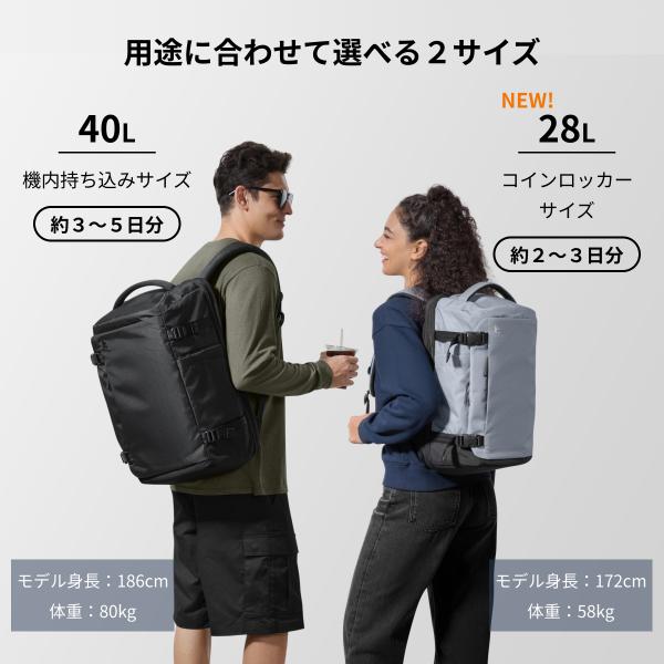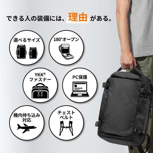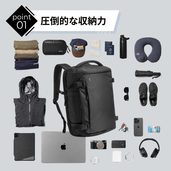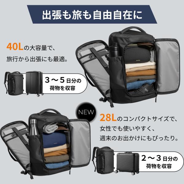 ■28Lの合理化された容量と圧縮可能な構造で、ノートPC・タブレット・旅行必需品を整理収納