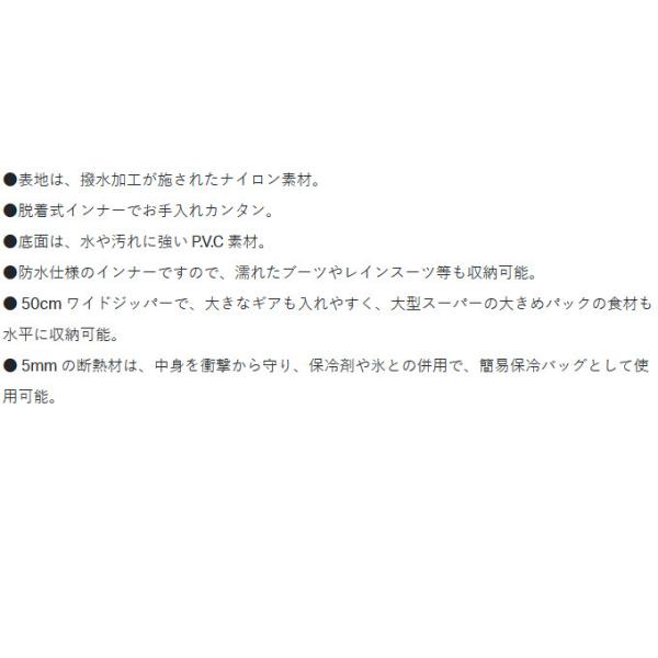 ● 50cm ワイドジッパーで、大きなギアも入れやすく、大型スーパーの大きめパックの食材も水平に収納可能。