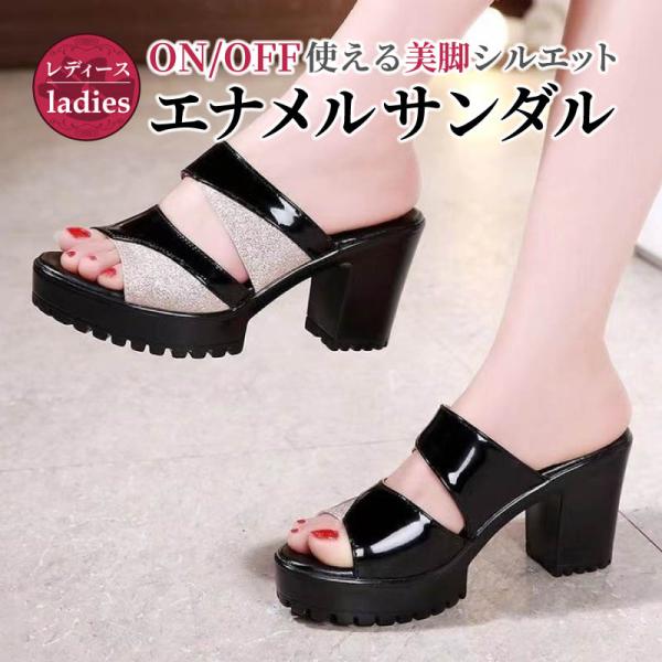 ミュール サンダル レディース エナメル 厚底 チャンキーヒール 太ヒール 履きやすい 歩きやすい 痛くない 春 夏 秋 冬 美脚 オフィス 黒 ブラック おしゃれ