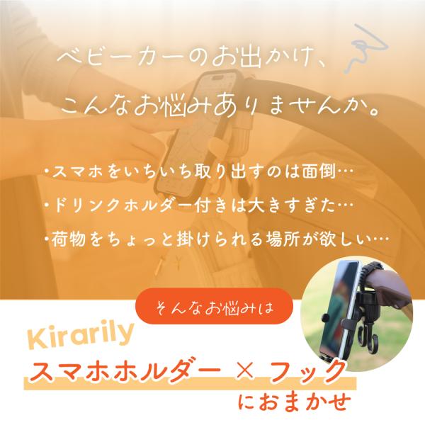ベビーカーでのお出かけに「これひとつあれば便利!」と思える、スマホホルダーとフックが一体になったKirarilyのスマホホルダー。