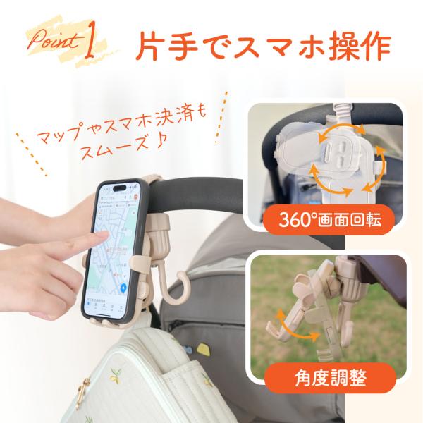 ベビーカースマホホルダー ベビーカーフック ベビーカー用 スマホ 携帯 取り付け簡単 撮影 360°回転 ベビーカー用 スマホスタンド ベビーカーグッズ