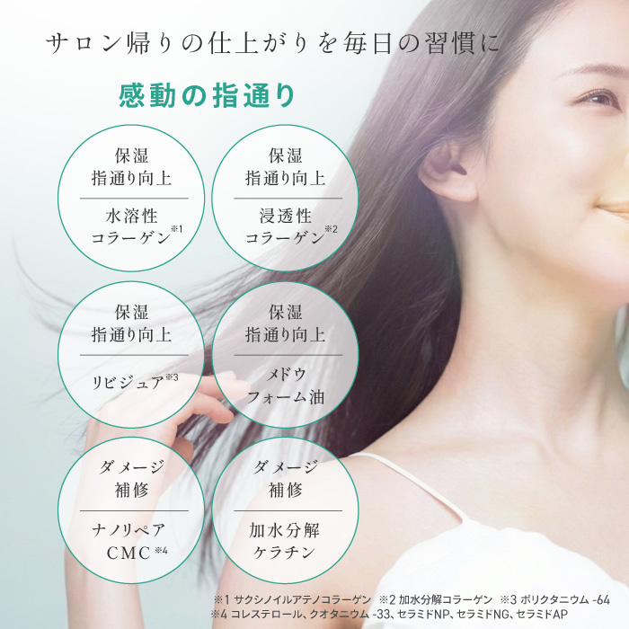 保湿・指通り向上成分(水溶性コラーゲン・浸透性コラーゲン・リピジュア・メドウフォーム油)とダメージ補修成分(ナノリペアCMC・加水分解ケラチン-ケラタイドTK-B)を贅沢配合。