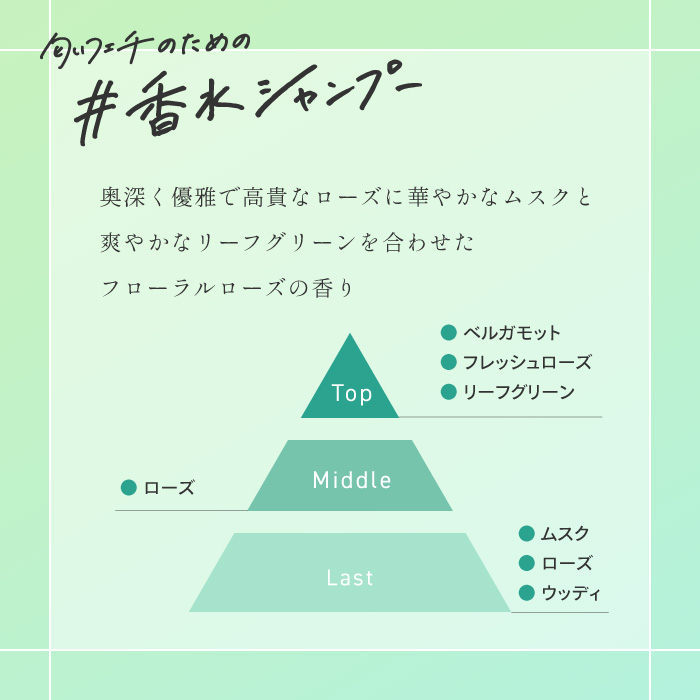 トップ、ミドル、ラストとノートのステップを経て香水のように広がる香りを採用し、香りにこだわる女性も満足させるヘアケアシリーズです。