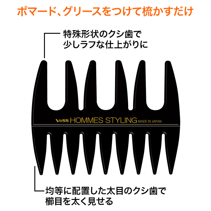 均等に配置したクシ歯は、髪にポマードやグリースをつけて梳かすだけで、太めのクシ目が作れるヘアスタイルができます。 特殊形状のクシ歯は、少しラフな仕上がりにしたい時におすすめです。