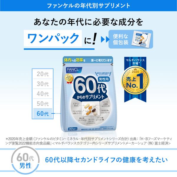 将来の健康を守り抜きたい60代以降の男性のための成分を厳選し、ワンパックに。サプリメントをこれから摂ろうと思っている人、摂り方のわからない方におすすめ!年代別・性別に適したサプリメントを、ワンパックにいたしました。どなたでも、自分にあったサプリメントを簡単に選ぶことができます。