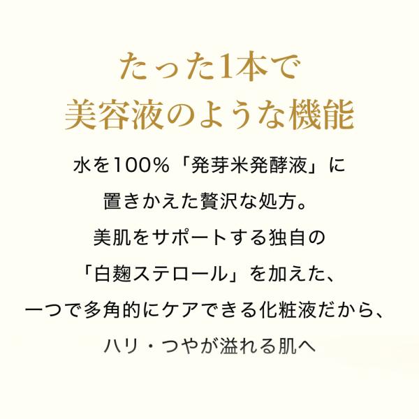 「発芽米発酵液」(*2)を水の代わりに100%置き換えて配合した、まるで美容液のような贅沢な化粧液。肌をほぐして(*3)たっぷりの美容液成分が角層深部までしみわたり、キメを整え、うるおい・ハリ・明るさまで多角的にケア。
