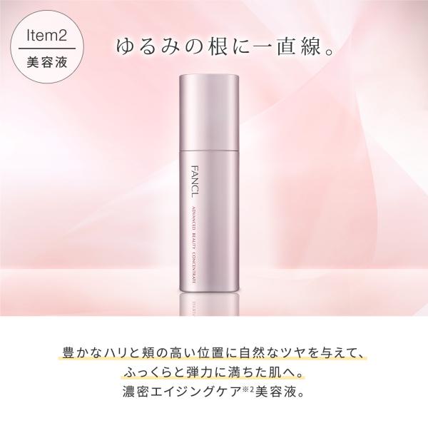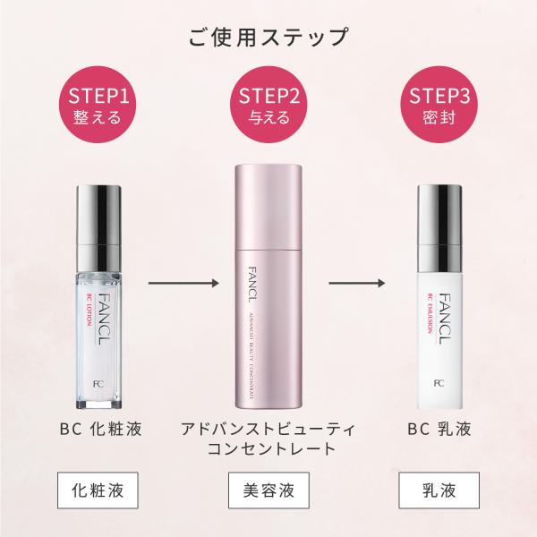 ハリ特化型美容液「アドバンストビューティーコンセントレート」、キメの整ったつややかな肌へ導く化粧液「BC 化粧液」、やわらかなツヤ肌へ導く乳液「BC 乳液」のセット。