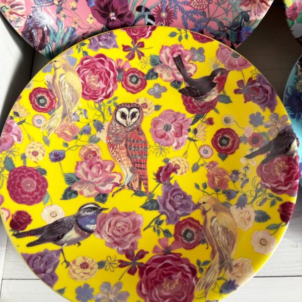 こちらは、大輪のお花に囲まれたフクロウや野鳥たちが見込みいっぱいに描かれたミディアム・プレート。
