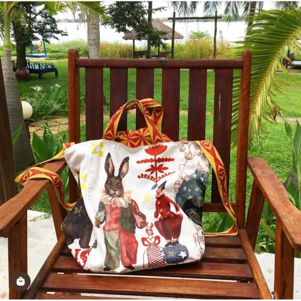 バッグの裏側は一面ナタリー・デザインのテキスタイル。リバーシブルすればたちまち東欧風バッグに大変身!