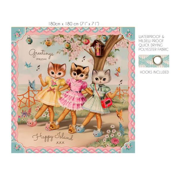 こちらは、猫ちゃんフェイスの女の子たちが楽し気に歌い踊る姿を描いたアーティスティックなシャワーカーテン♪