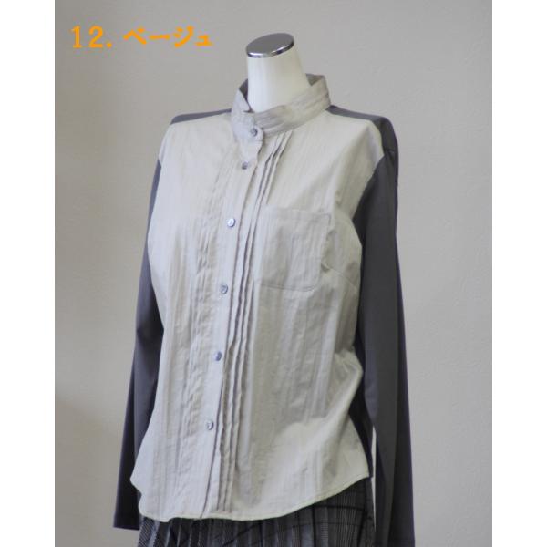 ブラウス、シャツ、ジャケットイン、スタンドカラー、ピンタック、伸縮性、無地