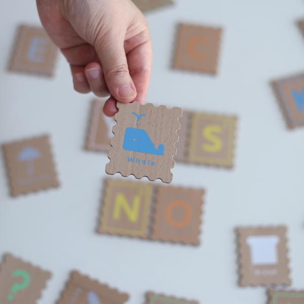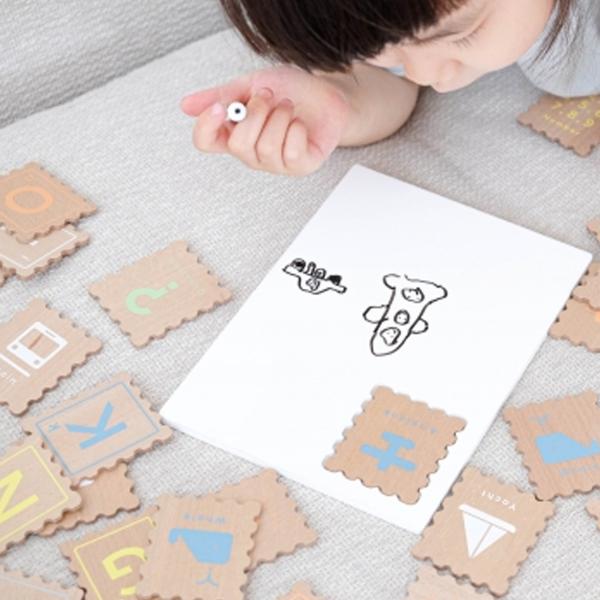 デザインおもちゃブランドdou?(ドウ)の おしゃれな切手のようなデザインの、木製アルファベットカードセットABC stamp。