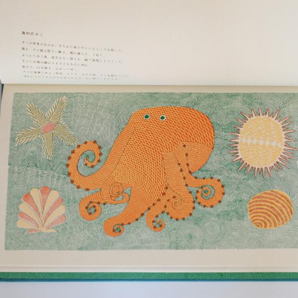 有機的で細やかな線描と、固定的な配色で表現された水の生きものたち。