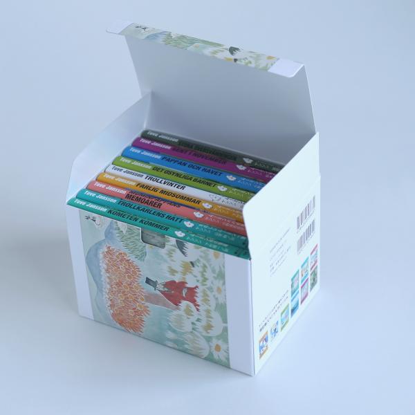 9冊が収まるボックスにも、ヤンソンのカラー絵を、ぐるっと一周贅沢に使用し、
