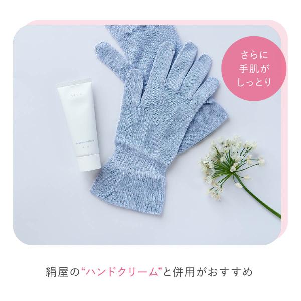 シルクの保湿効果で手肌をケア。ハンドクリームとも併用OKです。当社スタッフは、食器洗いの時にゴム手袋の中にこちらの手袋をつけているそうです。