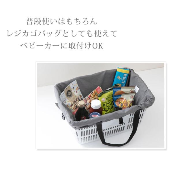 スーパーにある約30リットルのレジカゴにぴったりの大容量サイズで、お買い物したものを詰めて、そのままワンタッチでベビーカーに取付けができちゃいます。