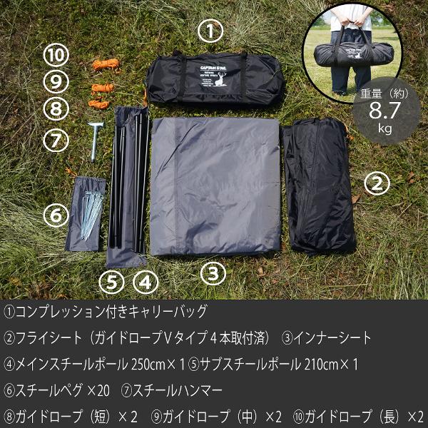●材質:フライ/ポリエステルリップストップ210T(PU2000mm)UV加工・撥水加工、インナー/ウォール=ポリエステル185T(通気性撥水加工)、メッシュ=ポリエステルノーシームメッシュ、フロア=ポリエステルOXF150D(PU3000mm)、ポール/スチールポール(粉体塗装)直径22・直径19mm