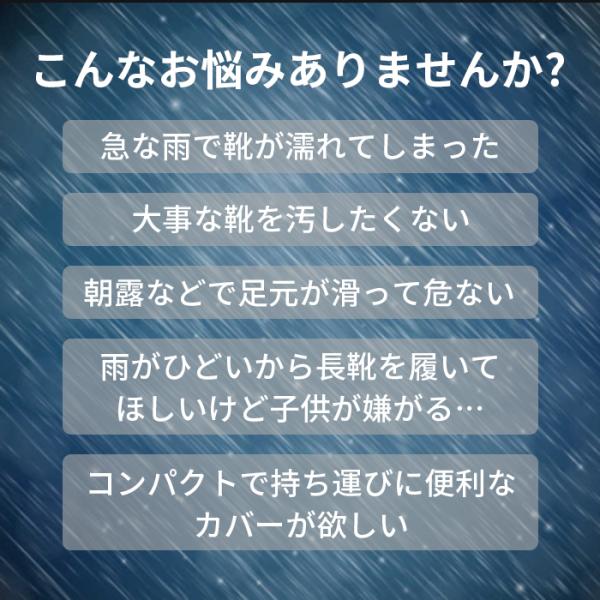 伸縮性のある素材で、丈夫で履きやすく、靴にピッタリとくっつき雨の侵入を防ぎます。