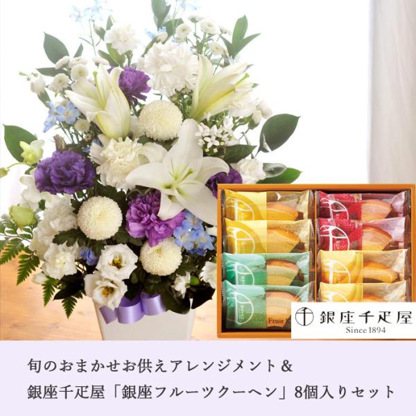 お供え 花とスイーツ 旬のおまかせお供え花Lサイズ と 【銀座千疋屋】フルーツクーヘン8個入りセット 仏花 お悔やみ お彼岸 お盆 四十九日 一周忌 命日 FKAA