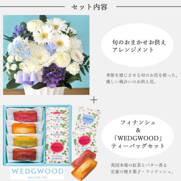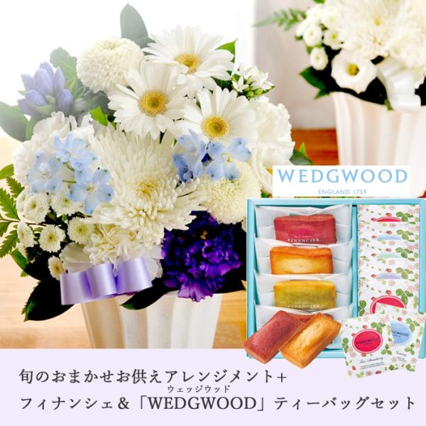 お供え花とスイーツ 洋花を使った旬のおまかせ お供え花 Sサイズ + フィナンシェ&「ウェッジウッド」ティーバッグ WEDGWOOD 即日発送 あすつく お悔み FKAA