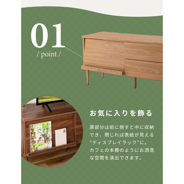 お気に入りを飾れる“フラップ式収納”と、日用品をすっきり隠せる“引き出し収納”を兼ね備えた、機能的なテレビボード。