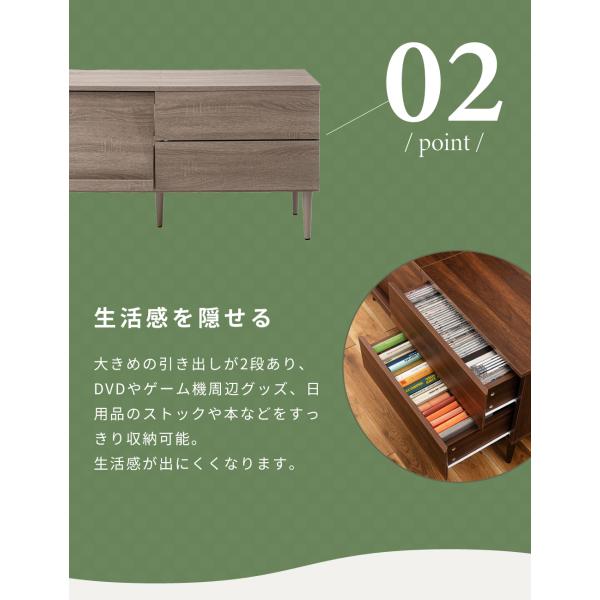 大きめの引き出しが2段あり、DVDやゲーム機周辺グッズ、日用品のストックや本などをすっきり収納可能。