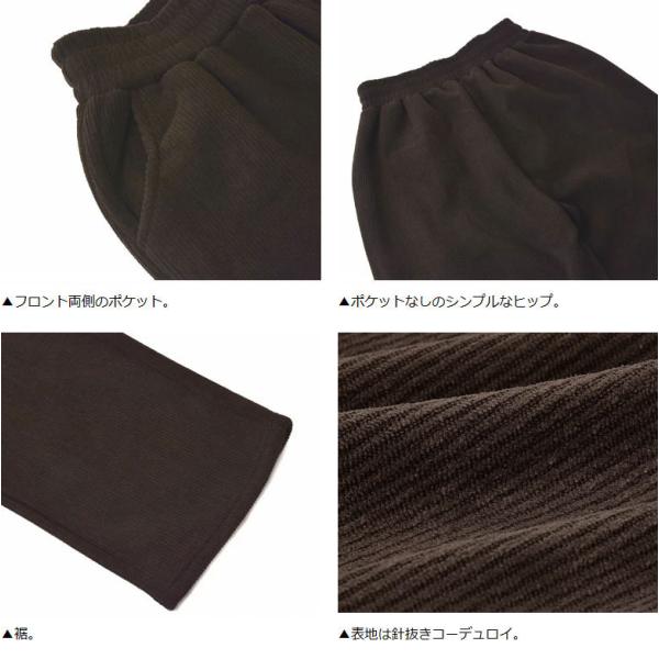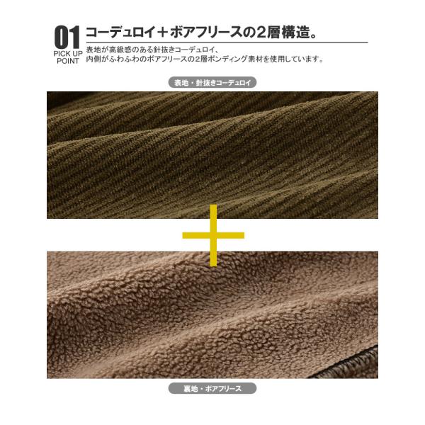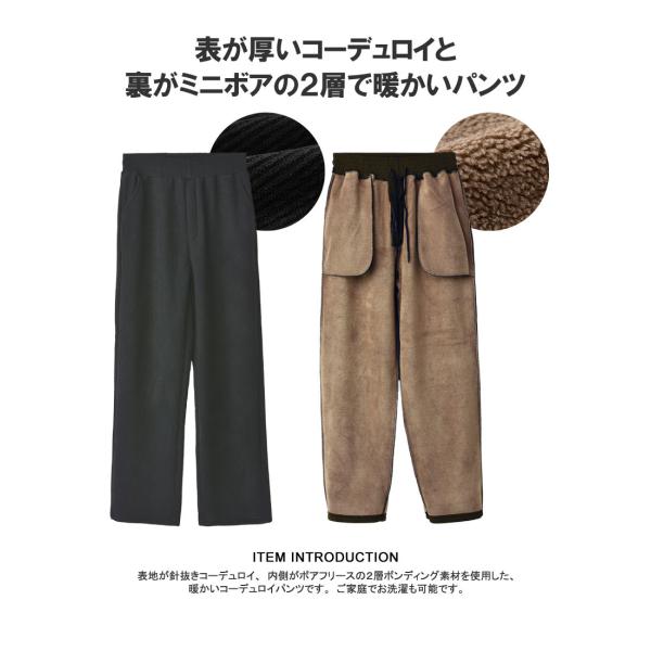 表地が針抜きコーデュロイ、内側がボアフリースの2層ボンディング素材を使用した、暖かいコーデュロイパンツです。