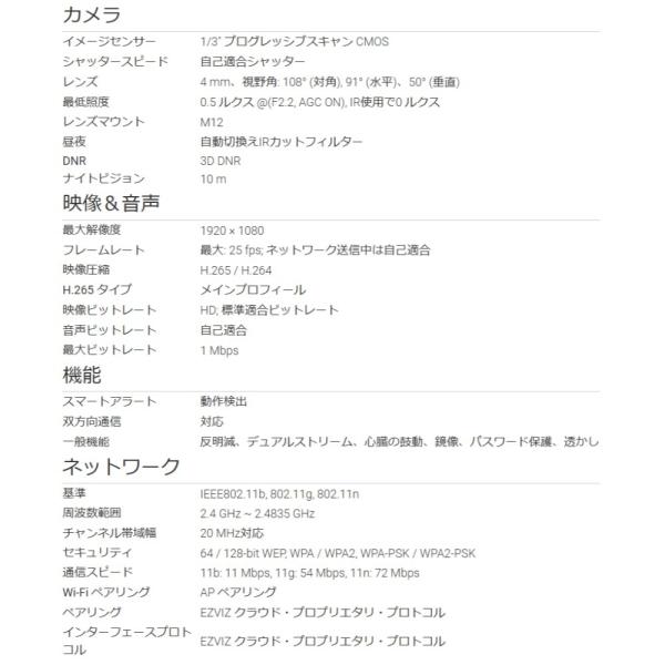 防犯カメラ ペットカメラ 見守りカメラ 屋内用 EZVIZ C2C ワイヤレス 無線 暗視 定点撮影 フルHD 1080p 超広角 双方向通話 ホワイト CS-C2C ◆宅