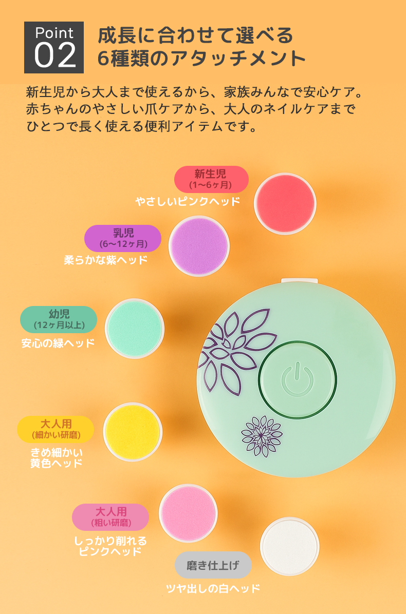 - 成長に合わせて選べる6種類のアタッチメント。新生児から大人まで使える6種類のアタッチメントで、家族みんなのネイルケアに対応します。