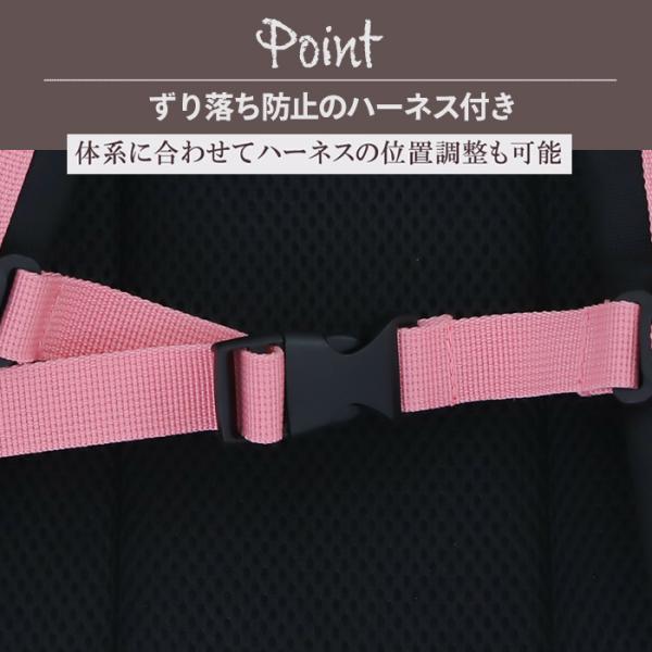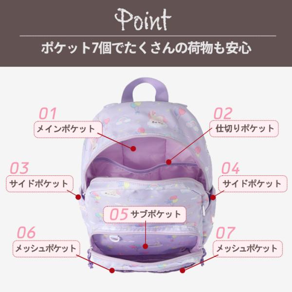成長の早い年中〜小学校高学年まで使えるサイズ感です。 元気に動き回るお子様のリュックのずり落ちを防止する、安心のハーネスつき!! ショルダーやハーネスは高さや長さを細かく調節できるため、より体に合わせて使うことができますメインルームは、A4ノートやフラットファイルが入る大きさで、通園や通学・遠足やお出かけなど様々なシーンで大活躍してくれます! フロントと内部にそれぞれポケットがついているため、ハンカチや鍵、パスケース等の小物の収納に◎ サイドポケットはギャザー付きでペットボトルが入ります。各所にDカンを配置し パスケースや防犯ブザーも付けられます。