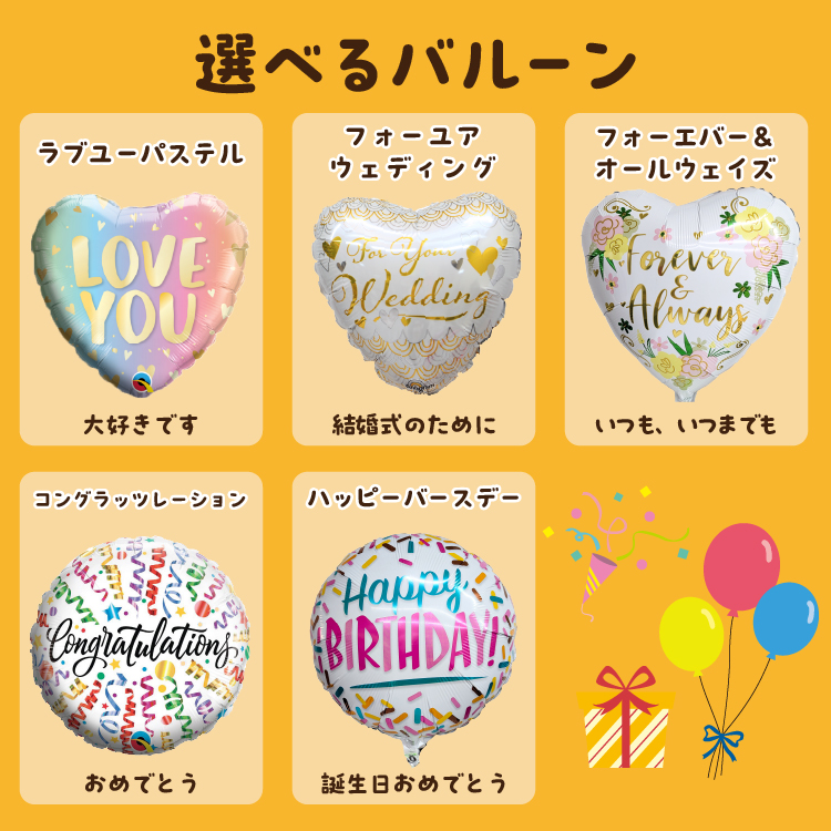5つのハート型バルーンと選べるお祝いバルーン1つ、合計6つのバルーンがセットになったバルーンギフトです。