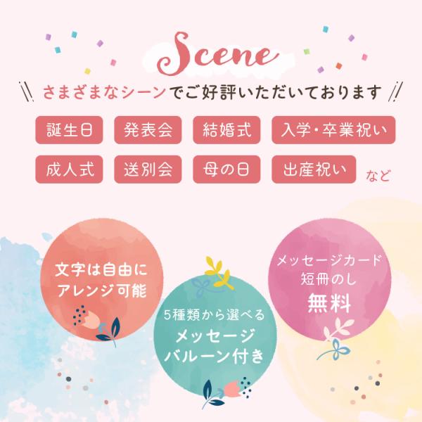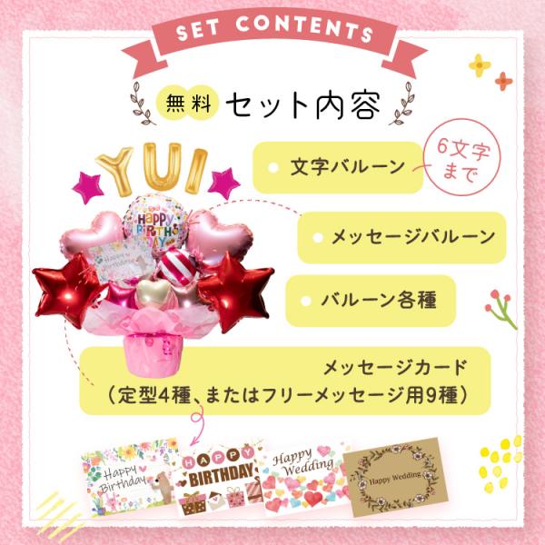 真ん中のバルーンも、「Happy Birth Day」「CONGRATS」「ハート」の3種類ございますので、シーンに合わせてお選びいただけます。