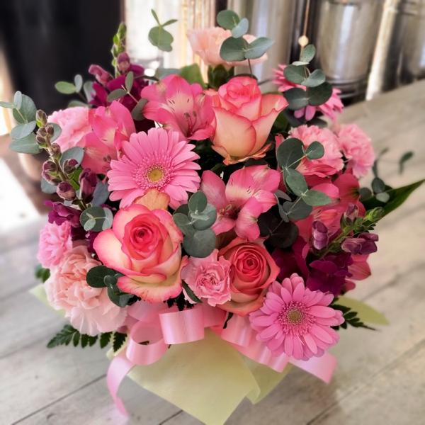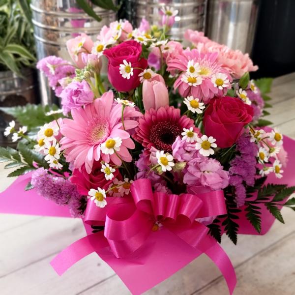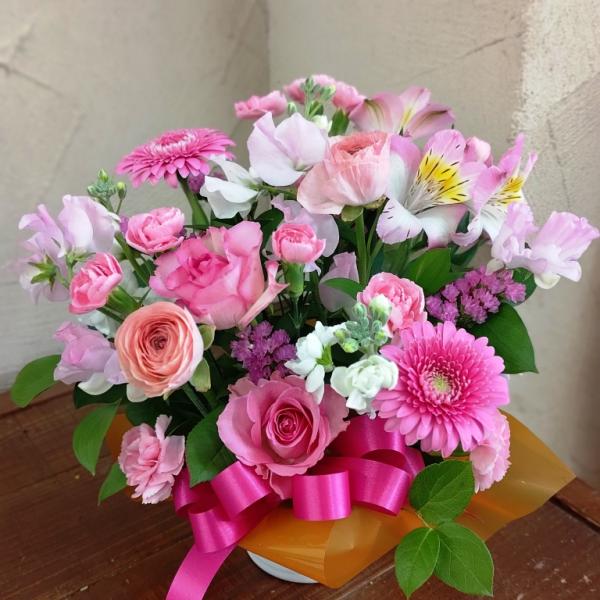 ピンクのワンサイドフラワーアレンジメント そのまま飾れる 送料無料 誕生日 お祝い 記念日 送別