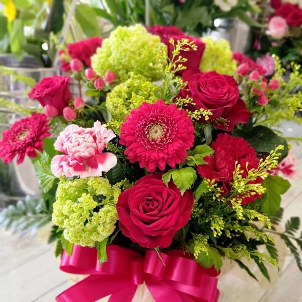この赤いワンサイドのフラワーアレンジメントは、美しさとエレガンスを兼ね備えた贅沢なギフトです。豊かな赤色のバラ、カーネーション、(季節によって花材は変わります)そしてグリーンリーフが、フラワーアレンジメント全体を包み込んでいます。このアレンジメントは、誕生日、記念日、バレンタインデー、母の日、または特別なイベントの贈り物として最適です。高品質の花材を使用して手作りされ、贈り物としても自宅用としても素晴らしいインテリアとして使えます。この贅沢な赤いワンサイドのフラワーアレンジメントをお届けします。